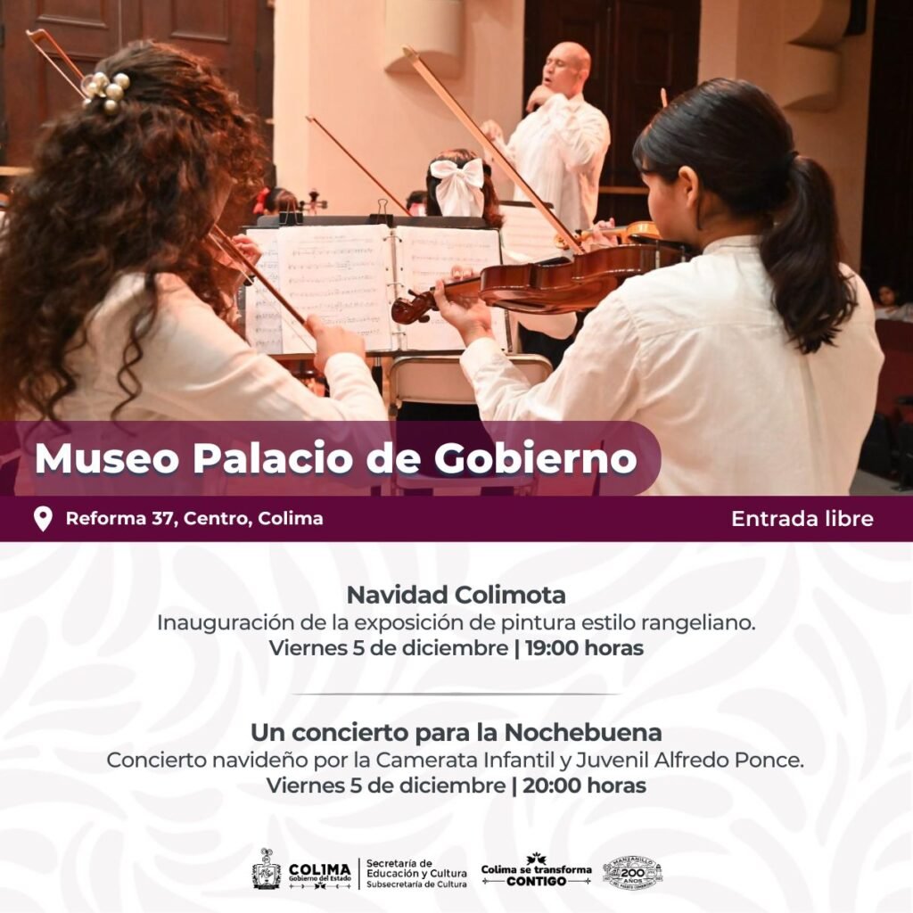 El Museo Palacio de Gobierno tendrá actividad con la inauguración de la exposición de pintura estilo rangeliana ‘Navidad Colimota’, el viernes 5 a las a las 19:00 horas. Y ese mismo día, a las 8:00 de la noche, el público asistente podrá disfrutar de ‘Un concierto para la Nochebuena’.