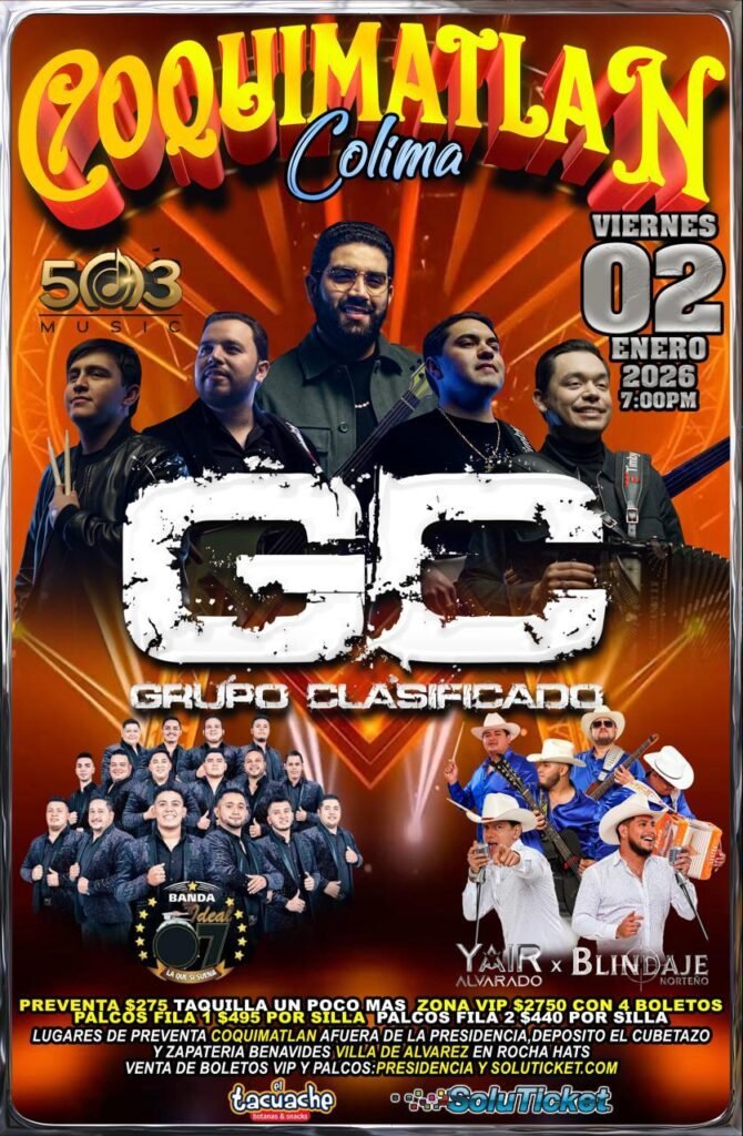 El viernes 2 de enero se presenta “Grupo Clasificado”, alternando con Banda La Ideal, Yair Alvarado y Blindaje Norteño y los costos son en preventa de 275 pesos, en taquillas un poco más; Zona VIP 2,750 pesos, con 4 boletos, Palcos Fila 1, 495 pesos por silla, Palcos Fila 2, 440 pesos por silla.