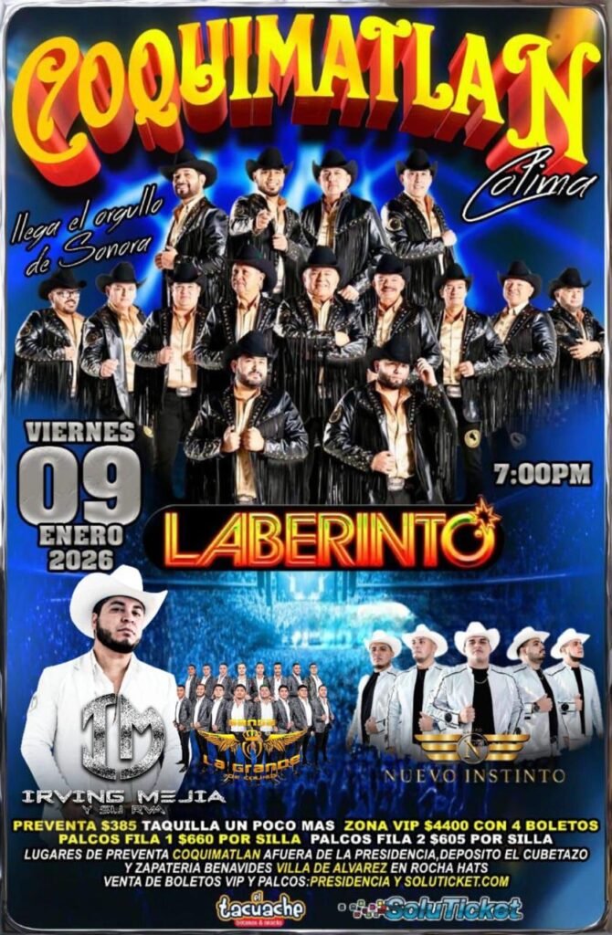 El viernes 9 de enero llega con sus exitazos el grupo “Laberinto” el cual alterna previo con Banda La Grande, Irvin Mejía y Nuevo Instinto y los costos de preventa son de 385 pesos, en taquillas un poco más, Zona VIP 4,400 con 4 boletos, Palcos Fila 1, 660 pesos por silla, Palcos Fila 2, 605 pesos por silla.