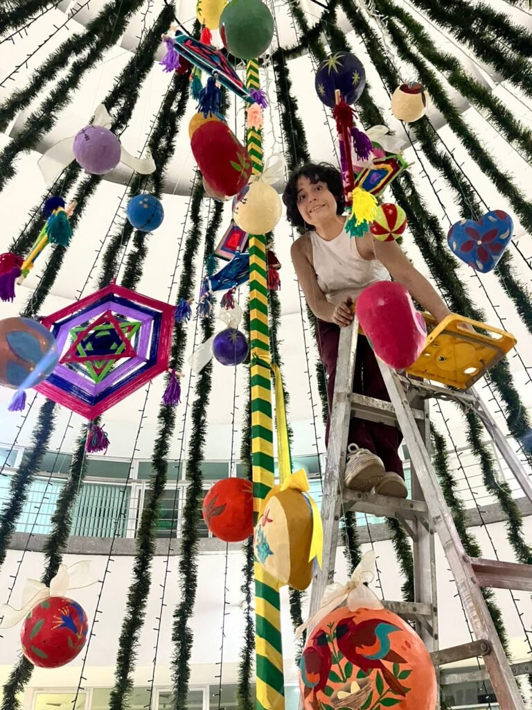 Estudiantes de la Licenciatura en Artes Visuales de la Universidad de Colima diseñaron y construyeron un enorme árbol navideño en el centro del edificio administrativo del campus central. La pieza destaca no sólo por su presencia escultórica, sino también por su carácter interactivo, pues las y los visitantes pueden ingresar en su interior y recorrerlo como una instalación artística.
