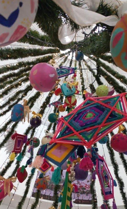Todos los elementos que componen la ornamentación del árbol fueron realizados con técnicas artesanales, como la cartonería para las esferas y madera e hilos para los ojos de Dios, que son amuletos de la cultura huichol. Por último, se realizaron copos de nieve a partir de patrones que se repiten y ensamblan para generar la figura tridimensional.