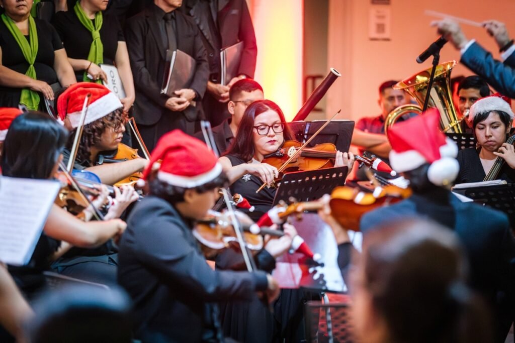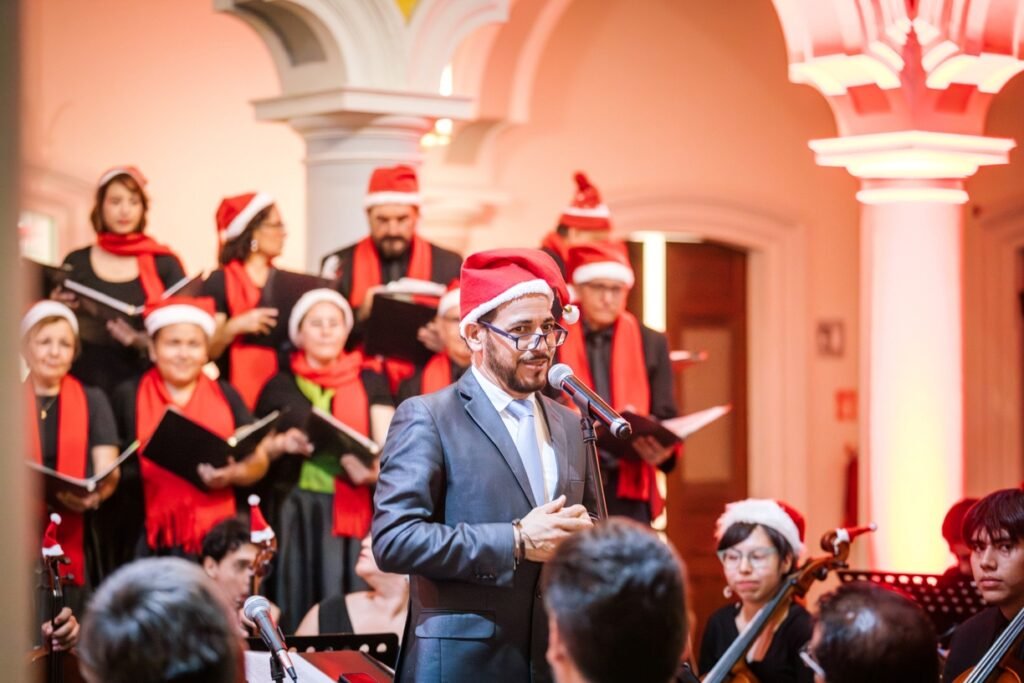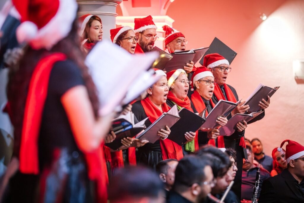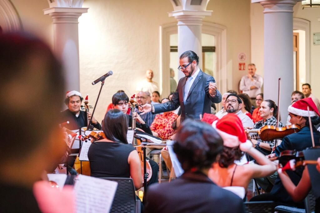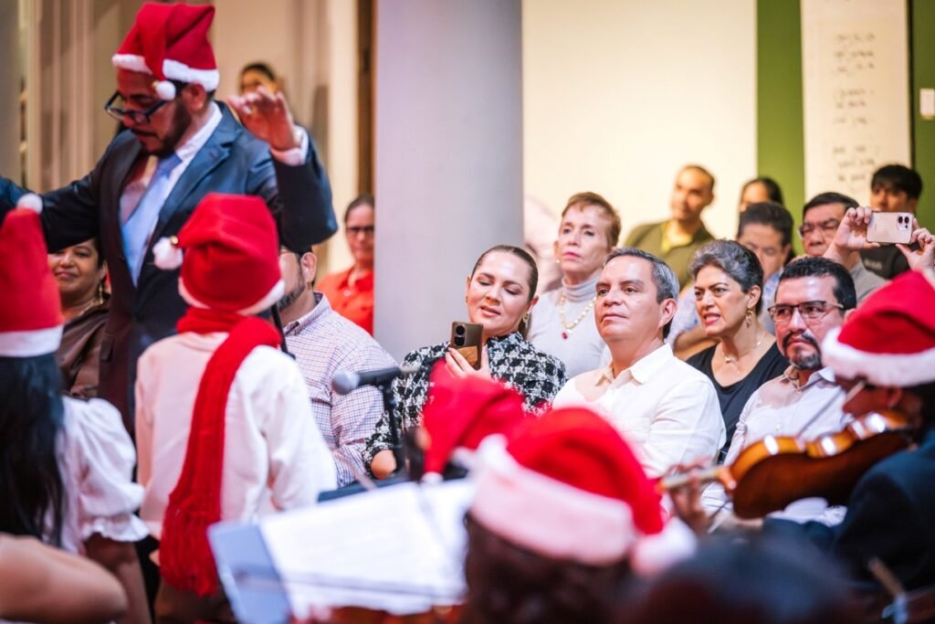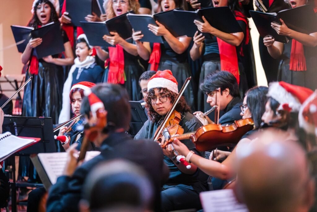 Para cerrar las actividades artísticas universitarias de este 2025, se llevó a cabo este jueves 18 de diciembre en la Pinacoteca Universitaria, el concierto “A Christmas Festival”, donde la Orquesta Sinfónica y el Coro de la Universidad de Colima, bajo la dirección del maestro José Antonio Frausto Zamora, ofrecieron un programa con temas de compositores como Wolfgang Amadeus Mozart, George Frederic Haendel, John Williams y Agustín Lara, en un acto que contó con la presencia del rector de la casa de estudios, Christian Torres Ortiz Zermeño.