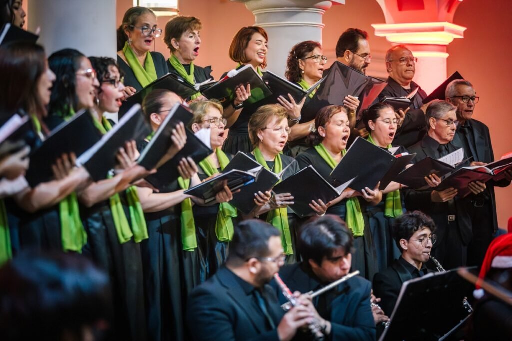 A continuación, las notas de la orquesta y las voces del coro dieron vida a “Gloria”, de la Misa de Coronación en Do mayor, KV 317 de W. A. Mozart, conduciendo al público a un momento de solemnidad que muestra la profunda espiritualidad del compositor austriaco. Momentos después se escuchó en el recinto “Cantate Domino”, en la cual el compositor contemporáneo Valentino Miserachs combina en su lenguaje musical elementos de la tradición coral con una escritura moderna, dinámica y llena de vitalidad.