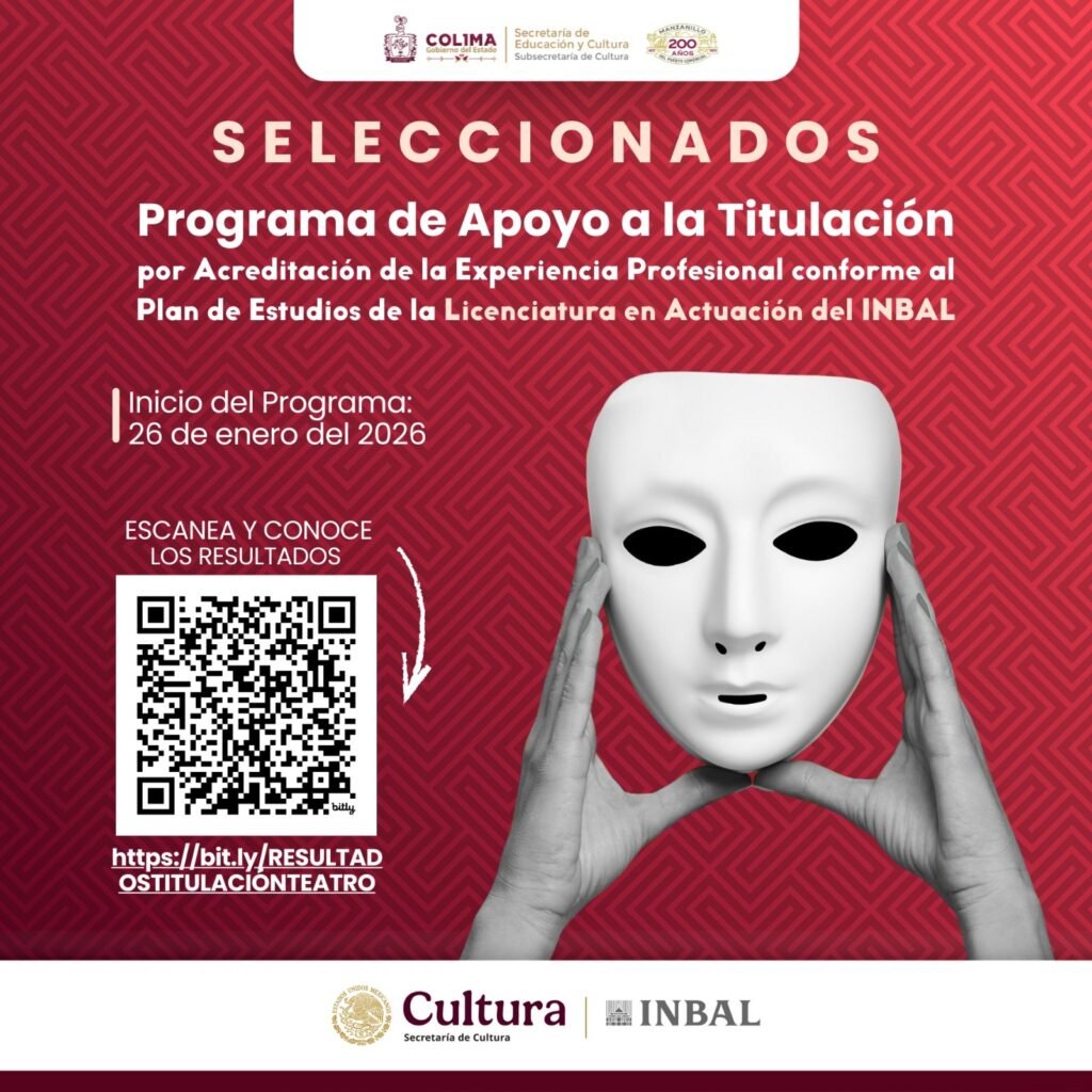 La Secretaría de Cultura del Gobierno de México, a través del Instituto Nacional de Bellas Artes y Literatura (INBAL), en coordinación con el Gobierno del Estado de Colima, vía la Subsecretaría de Cultura, informan los resultados del Programa de Apoyo a la Titulación por Acreditación de la Experiencia Profesional, conforme al plan de estudios de la Licenciatura en Actuación del INBAL.