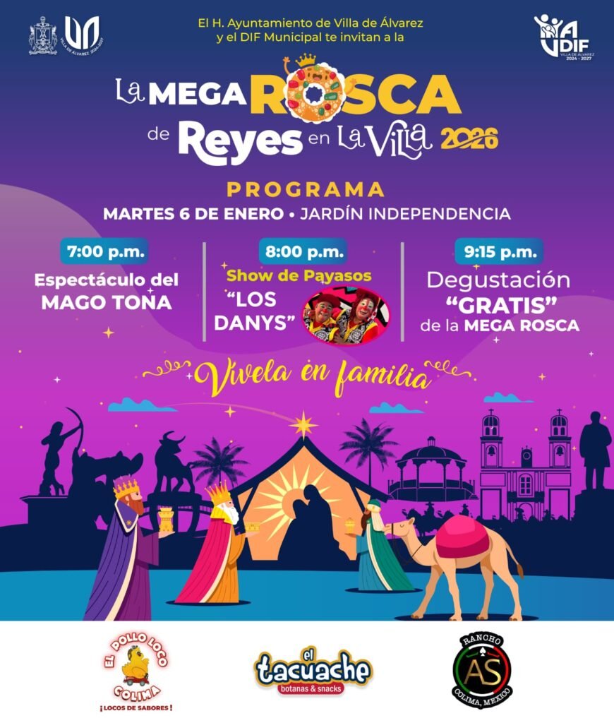 El Ayuntamiento de Villa de Álvarez anunció la celebración por quinto año consecutivo del Festival de la Mega Rosca de Reyes en la Villa 2026, que se realizará en el Jardín Principal a partir de las 7 de la noche del martes 6 de enero.