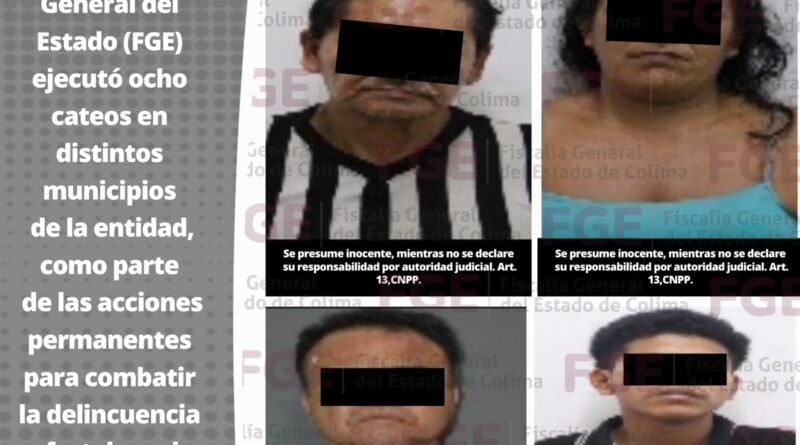 La Fiscalía General del Estado (FGE) de Colima ejecutó ocho cateos, en distintos municipios de la entidad, como parte de las acciones permanentes, para combatir la delincuencia y fortalecer la seguridad de la población colimense.