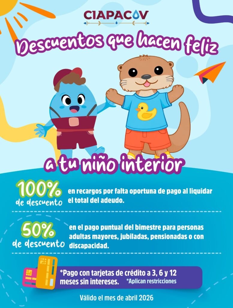 La Comisión Intermunicipal de Agua Potable y Alcantarillado de Colima y Villa de Álvarez (CIAPACOV) invita a las y los usuarios a aprovechar la campaña “Descuentos que hacen feliz a tu niño interior”, vigente durante todo el mes de abril, cuyo objetivo es facilitar la regularización del servicio de agua potable en los municipios de Colima y Villa de Álvarez.