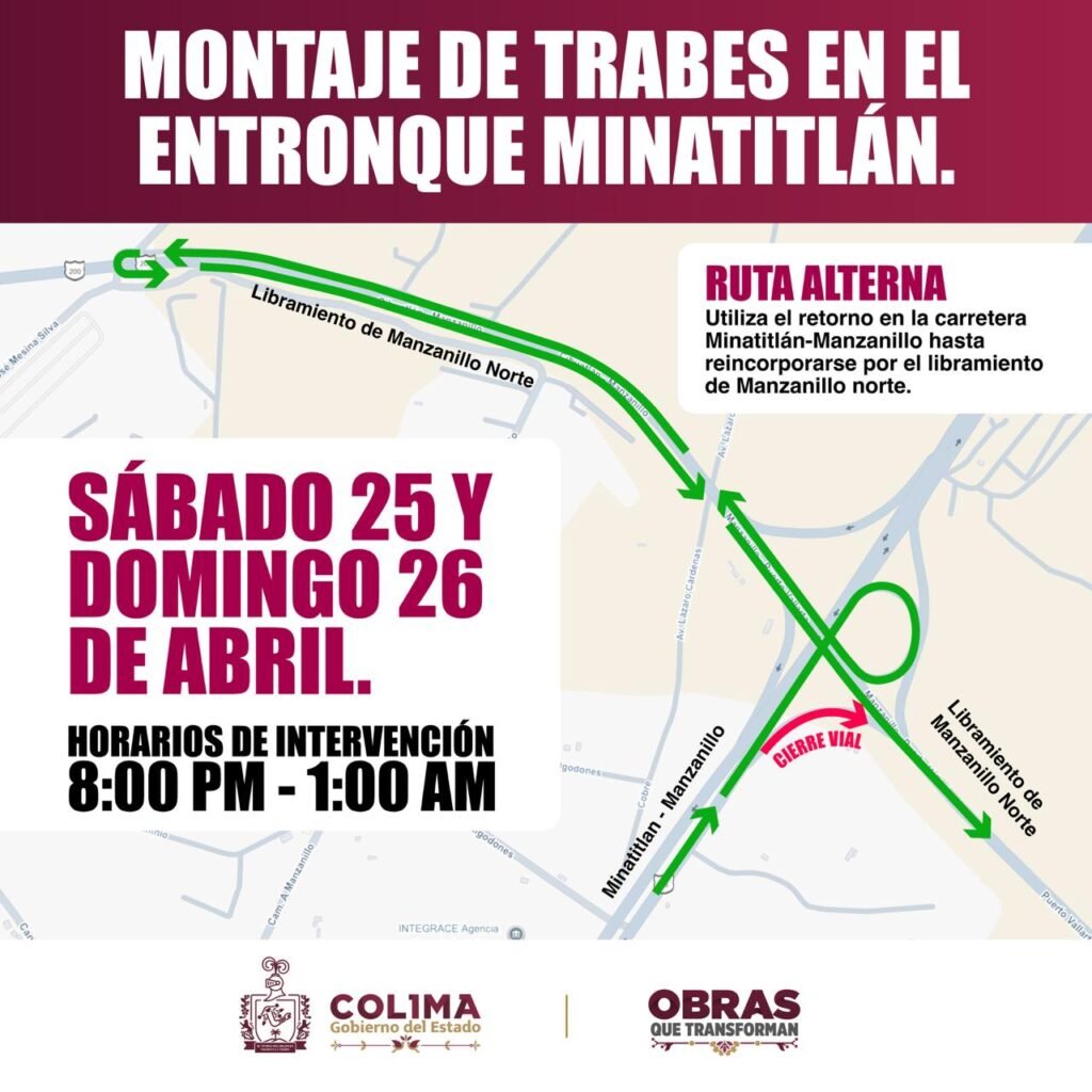 El Gobierno del Estado de Colima, a través de la Secretaría de Infraestructura, Desarrollo Urbano y Movilidad (Seidum), informa que este sábado 25 y domingo 26 de abril de 8:00 de la noche a 01:00 de la mañana se llevarán a cabo trabajos para el montaje de trabes en el Entronque Minatitlán en el municipio de Manzanillo, para dar continuidad a estas #ObrasQueTransforman la entidad.